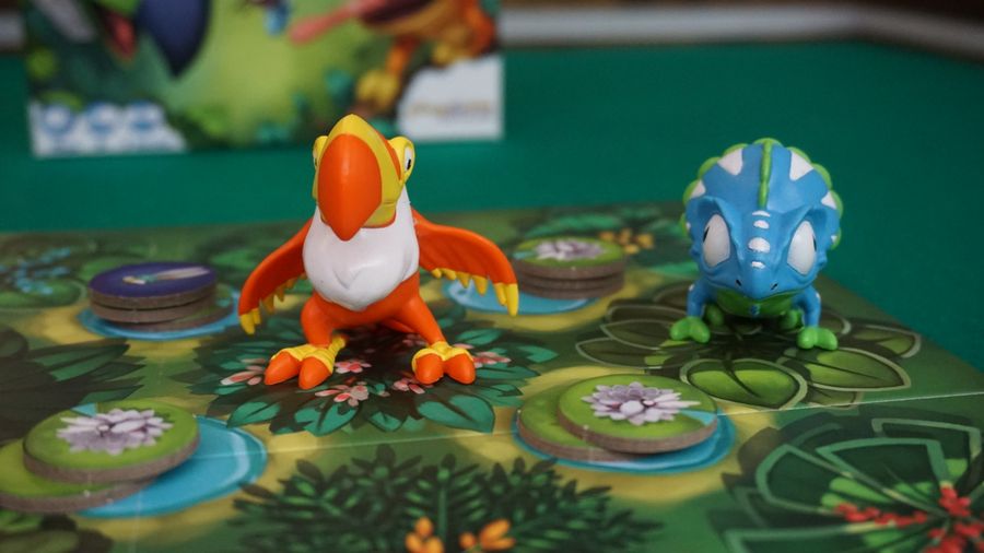 Cazamosquitos es un juego táctico para 2 jugadores, cada uno controlará a un camaleón y un tucán. El tablero es una cuadrícula de 4×4, con pilas de 3 marcadores de mosquito colocadas en las 9 intersecciones internas de la cuadrícula. En un turno, el jugador puede mover o bien su tucán o su camaleón. Para mover el camaleón, primero debes comerte uno de los mosquitos de una esquina del espacio en el que te encuentres, después mueve una casilla ortogonalmente. Para mover al tucán, debe hacerse en diagonal, comiéndose el mosquito por el que pases, el tucán puede mover más de un espacio en el mismo movimiento, pero debes poder comer en cada esquina por la que pases. Si no puedes alimentar uno de tus animales, no podrás moverte, si no puedes alimentar a ninguno de los dos, pierdes la partida y si consigues comerte nueve mosquitos amarillos, ganas inmediatamente. El juego también tiene mosquitos de otros colores con poderes especiales: mover un mosquito, mover uno de tus animales, forzar al oponente a jugar un determinado animal...